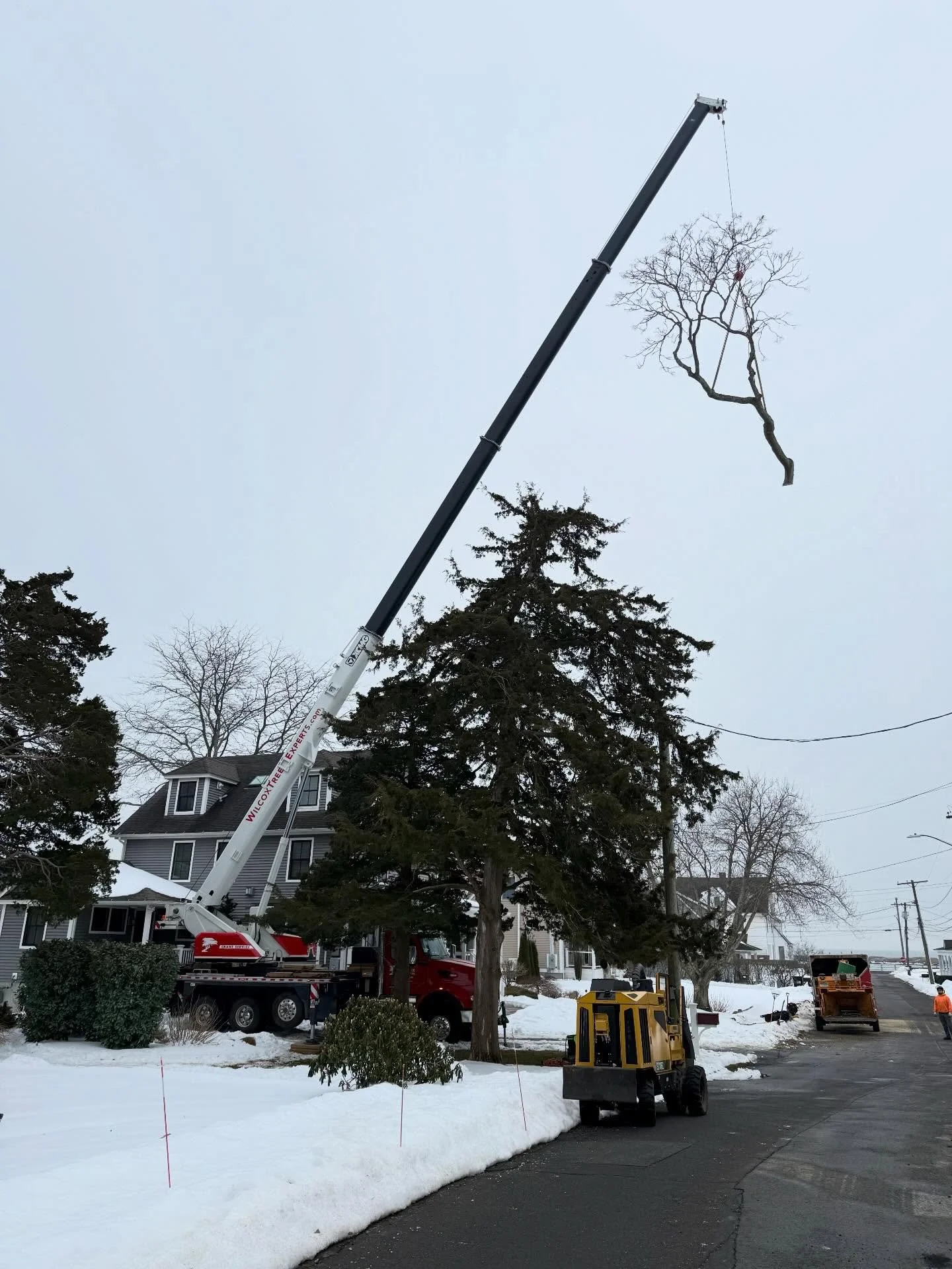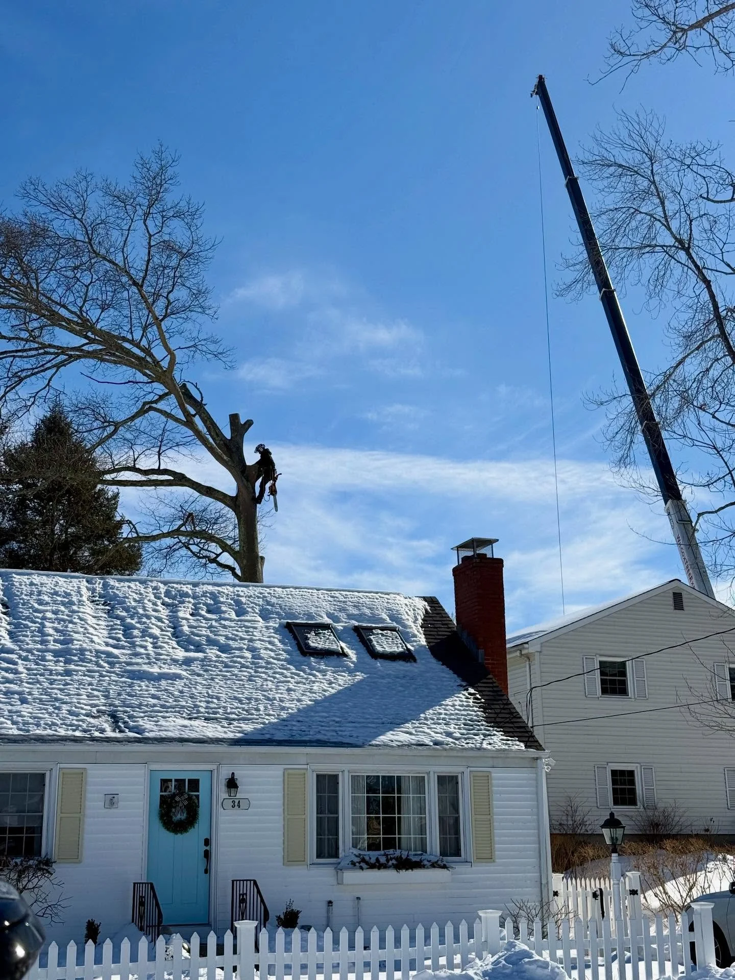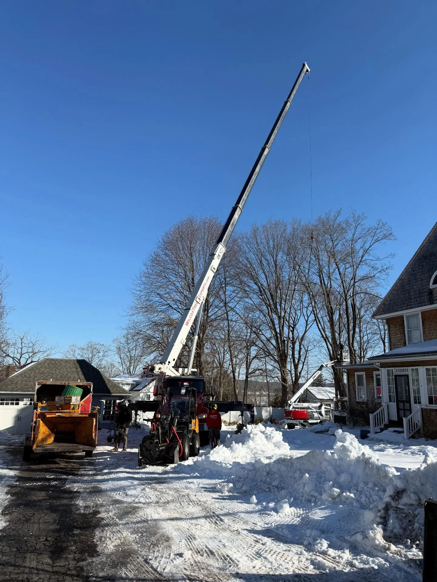 Wilcox Tree Experts provides crane services to safely remove large, hazardous, or hard-to-access trees with minimal impact on your property. Using a 40-ton, 142-foot boom crane and licensed operators, they lift tree sections away from homes, driveways, and structures for efficient removal and cleanup.