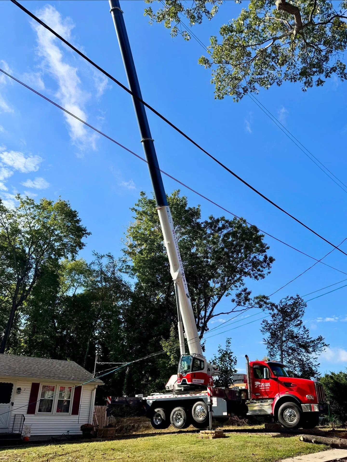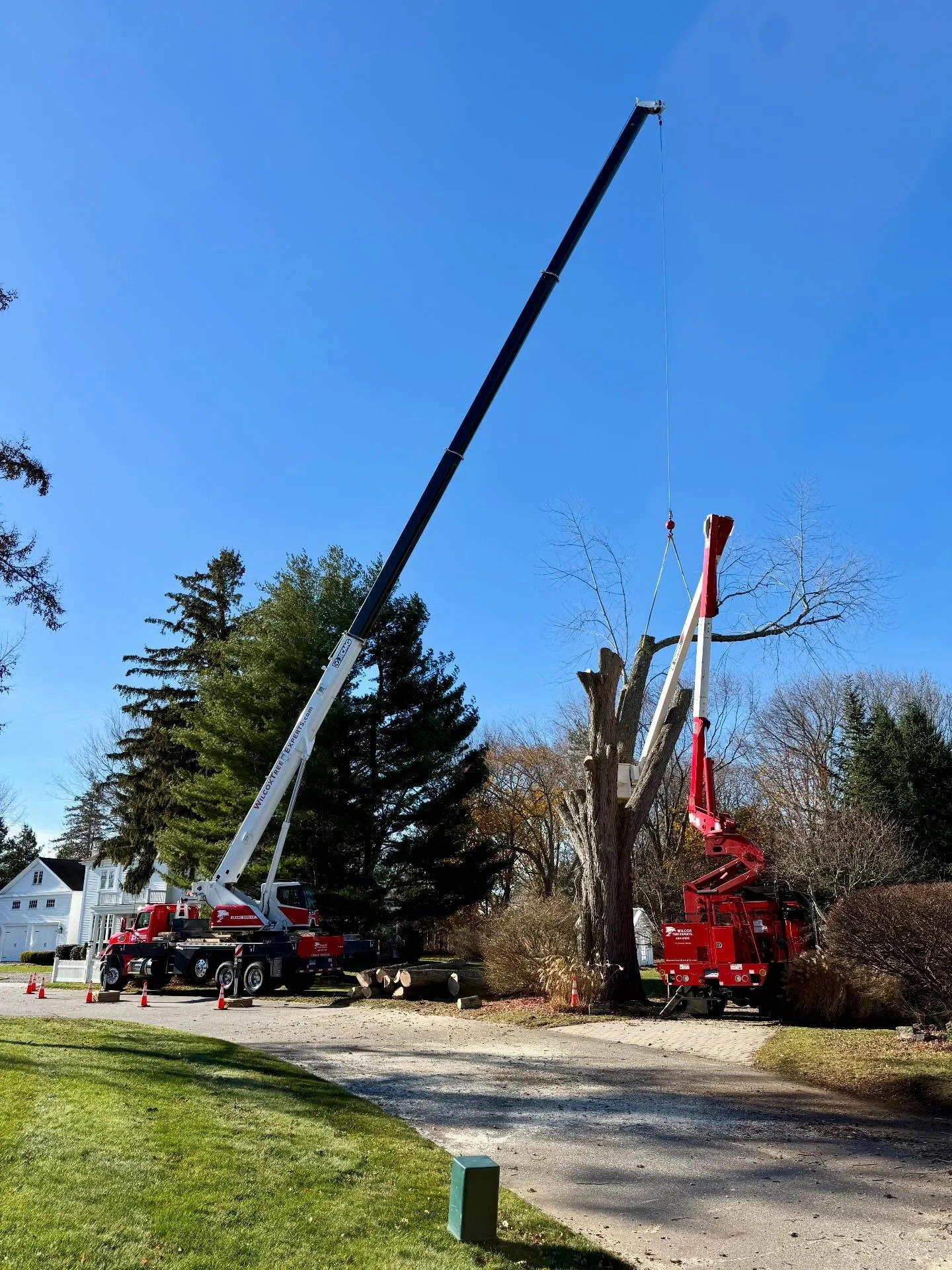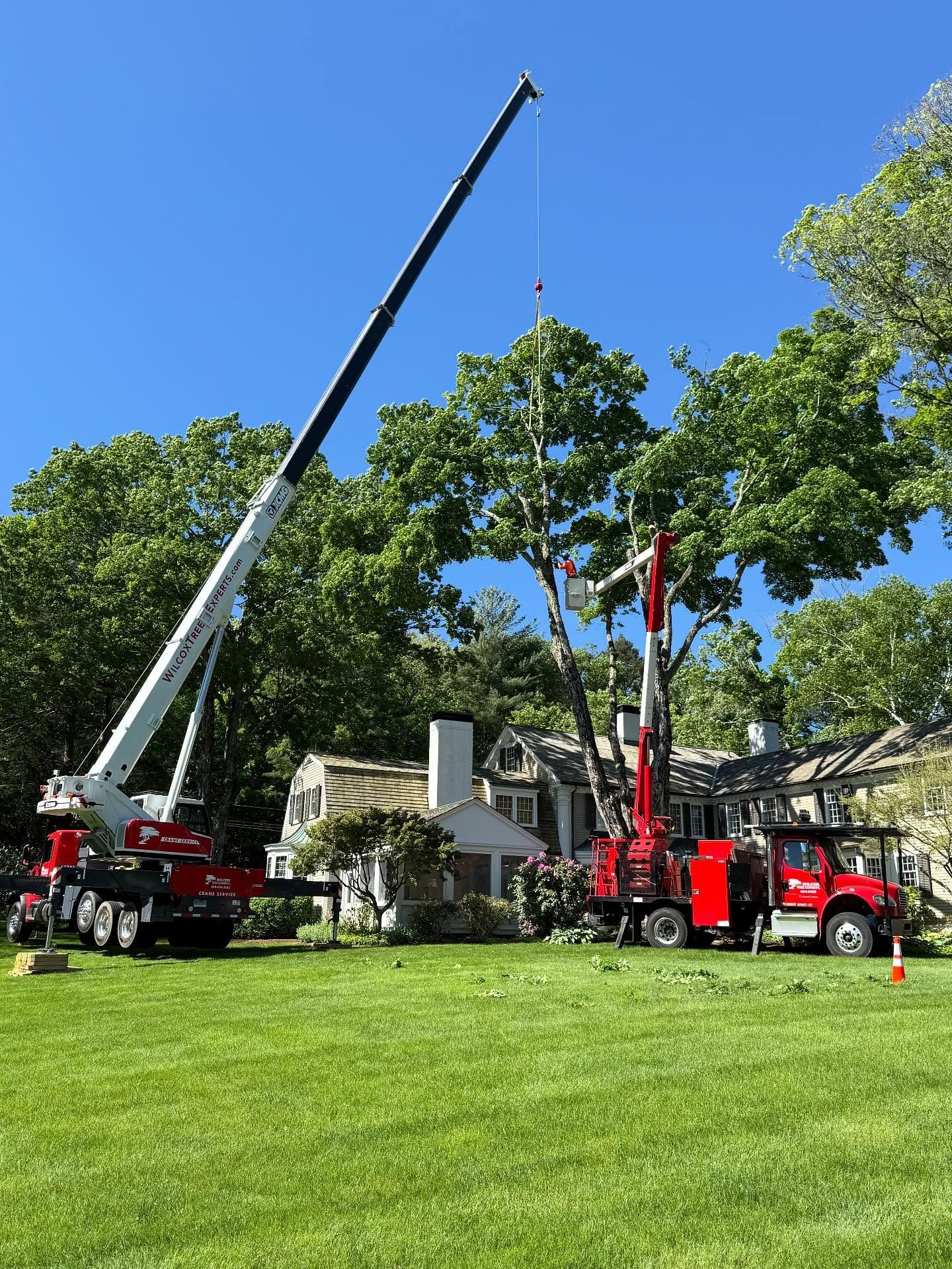 Wilcox Tree Experts provides crane services to safely remove large, hazardous, or hard-to-access trees with minimal impact on your property. Using a 40-ton, 142-foot boom crane and licensed operators, they lift tree sections away from homes, driveways, and structures for efficient removal and cleanup.